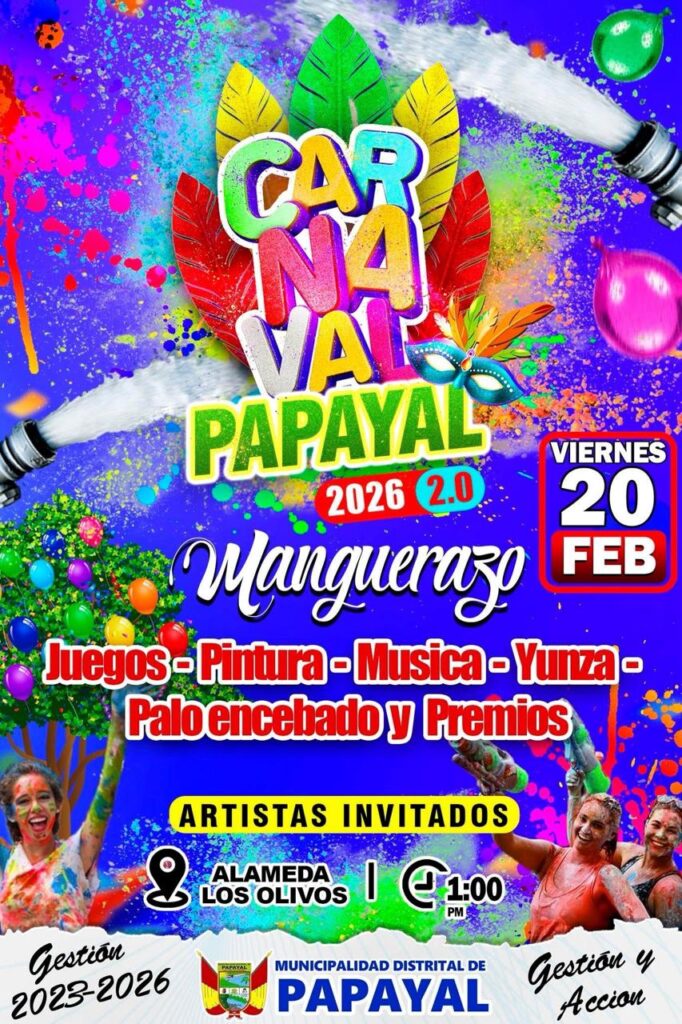 La Municipalidad Distrital de Papayal se complace en anunciar la realización del «Carnaval de Papayal 2026», programado para el 20 de febrero de 2026, a partir de las 14:00 horas. Este evento cultural y de integración social incluirá diversas actividades artísticas y recreativas, promoviendo la participación ciudadana y el turismo local. Invitamos a toda la comunidad y a los visitantes a unirse a esta festividad que celebra nuestras tradiciones y fortalece la convivencia en nuestro distrito.